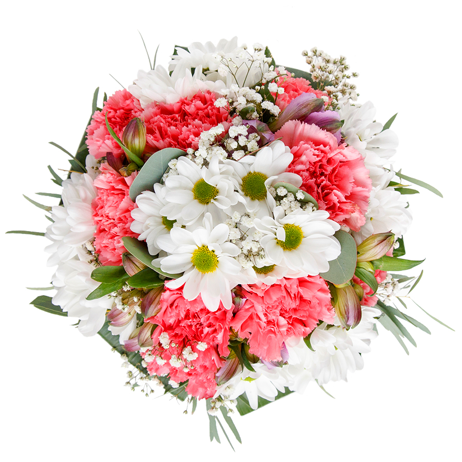Our Luxurious White Blossom Bouquet is a testament to timeless elegance and sophisticated design. Featuring a beautiful blend of snow-white chrysanthemums, soft gypsophila, and blush pink carnations, all arranged with rich aspidistra leaves for a striking presentation.
